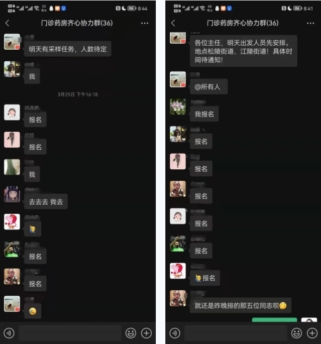 一轮又一轮的区域核酸采集就是抗击疫情的大战场,每每有采样任务下达,在药剂科的报名群里,大家争先恐后,抢着报名。
